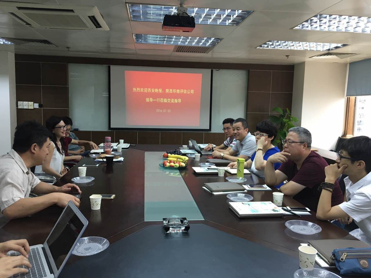 2016年7月1日至7月2日,陕西华地房地产估价咨询公司董事长及西安晚报社领导一行前来苏州、常州、深圳对智屋交易平台进行考察交流。苏州代表及苏州日报社领导顾总、常报智屋总经理舒友林、深圳市格衡土地房地产评估咨询有限公司董事长吴青等与考察团进行了座谈。