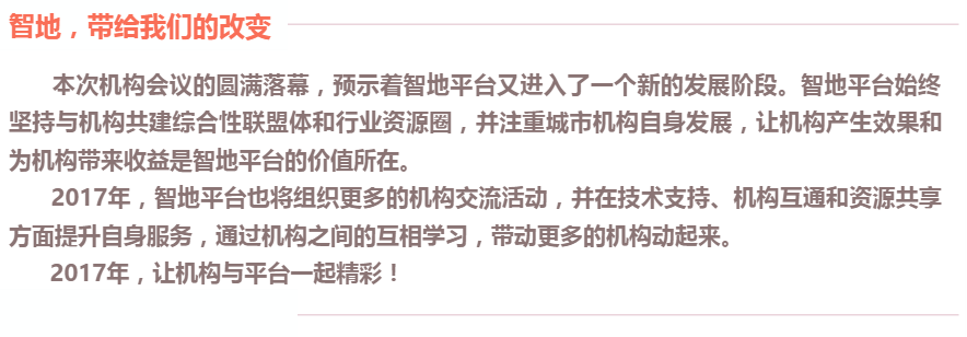 下午的主题演讲应该是真正进入“智地,带给我们的改变”的环节,由机构去讲述加入智地平台而得到的发展和改变。