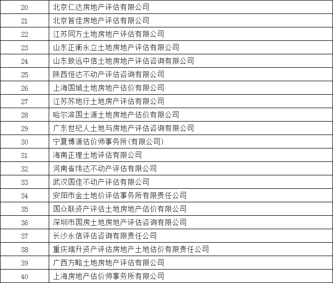 陕西华地房地产估价咨询有限公司 北京康正宏基房地产评估有限公司 苏州天元土地房地产评估有限公司 四川大成房地产土地评估有限公司 江苏同方土地房地产评估有限公司 山东致远中信土地房地产评估咨询有限公司 宁夏博源估价师事务所(有限公司) 广西方略土地房地产评估有限公司 重庆华川土地房地产估价与资产评估有限责任公司 贵州恒鉴不动产评估有限公司 江苏常地土地房地产评估有限公司 上海百盛土地估价有限责任公司 南京大陆土地房地产评估有限公司 大连天石不动产顾问有限公司 云南优化不动产评估咨询有限公司 江苏苏信房地产评估咨询有限公司 四川天地源土地资源房地产评估有限公司 湖北九洲房地产评估经纪事务所 广东金兰德房地产土地资产评估规划有限公司 江苏东诚亿土地评估房地产估价有限责任公司