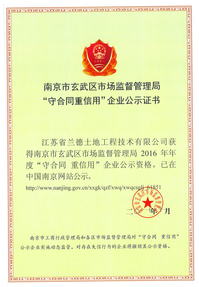 近日,在南京市玄武区市场监督管理局的严格检查验收下,江苏省兰德工程技术有限公司被授予2016年年度“守合同 重信用”企业荣誉称号,并颁发荣誉证书。兰德公司自成立以来,始终坚持诚信经营,在行业内树立了良好的口碑。获此殊荣,是苏信集团高度重视合同管理和社会诚信体系建设的结果,为苏信集团今后持续健康快速发展提供了更有力的信誉保障。