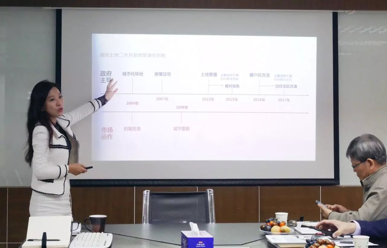 随后吴青董事长为来访专家深入介绍了深圳土地二次开发的模式、路径、难题等。她重点对深圳整村统筹、棚户区改造等进行分析,并通过《红坳村整村搬迁工作经验交流》的主题讲解,分享格衡参与红坳村搬迁工作总结的经验。