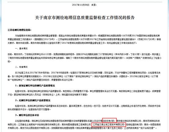 11月6日,南京市规划局在官网公示了本次检查结果,完成的测绘地理信息项目成果质量状况和质量管理体系建立及运行情况较好的共有5家测绘单位,江苏省苏信集团兰德土地工程技术有限公司为其中之一,我们深感荣幸。