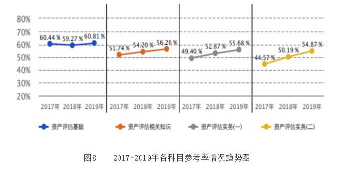 考试参考率最高的科目是《资产评估基础》,为60.81%;最低的科目是《资产评估实务(二)》,为54.87%。各科目历年参考率趋势,进一步印证了资产评估师的吸引力在逐渐增强。从科目参考率可以看出,职业资格考试越是基础性科目,参考率就越高。