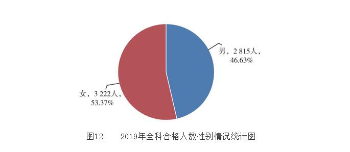 1.从性别看,2019年全科合格人员中,女性3222人,占比53.37%;男性2815人,占比46.63%。
