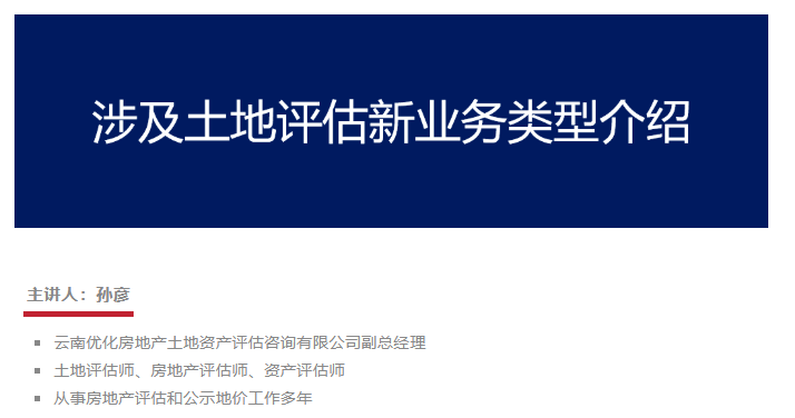 7月25日下午,智地平台“评估从业人员(土地估价方向)第四讲”远程视频培训正式开讲!本次培训由云南优化房地产土地资产评估咨询有限公司副总经理孙彦先生向大家介绍新阶段涉及土地估价的新业务与新技术,平台50余家成员机构报名参加了本次培训。