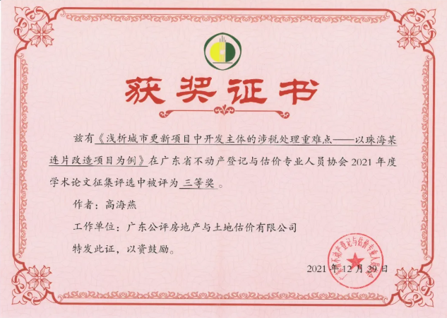 近日,我司评估师高海燕撰写的《浅析城市更新项目中开发主体的涉税处理重难点--以珠海某连片改造项目为例》荣获广东省不动产登记与估价专业人员协会2021年度学术论文征集评选三等奖!