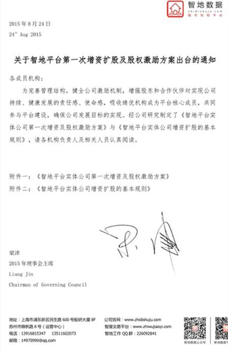 《智地平台增资扩股及股权激励方案通知》已上传至智地机构平台公告,智地成员机构可点击网站的成员入口,进入平台公告进行查阅。